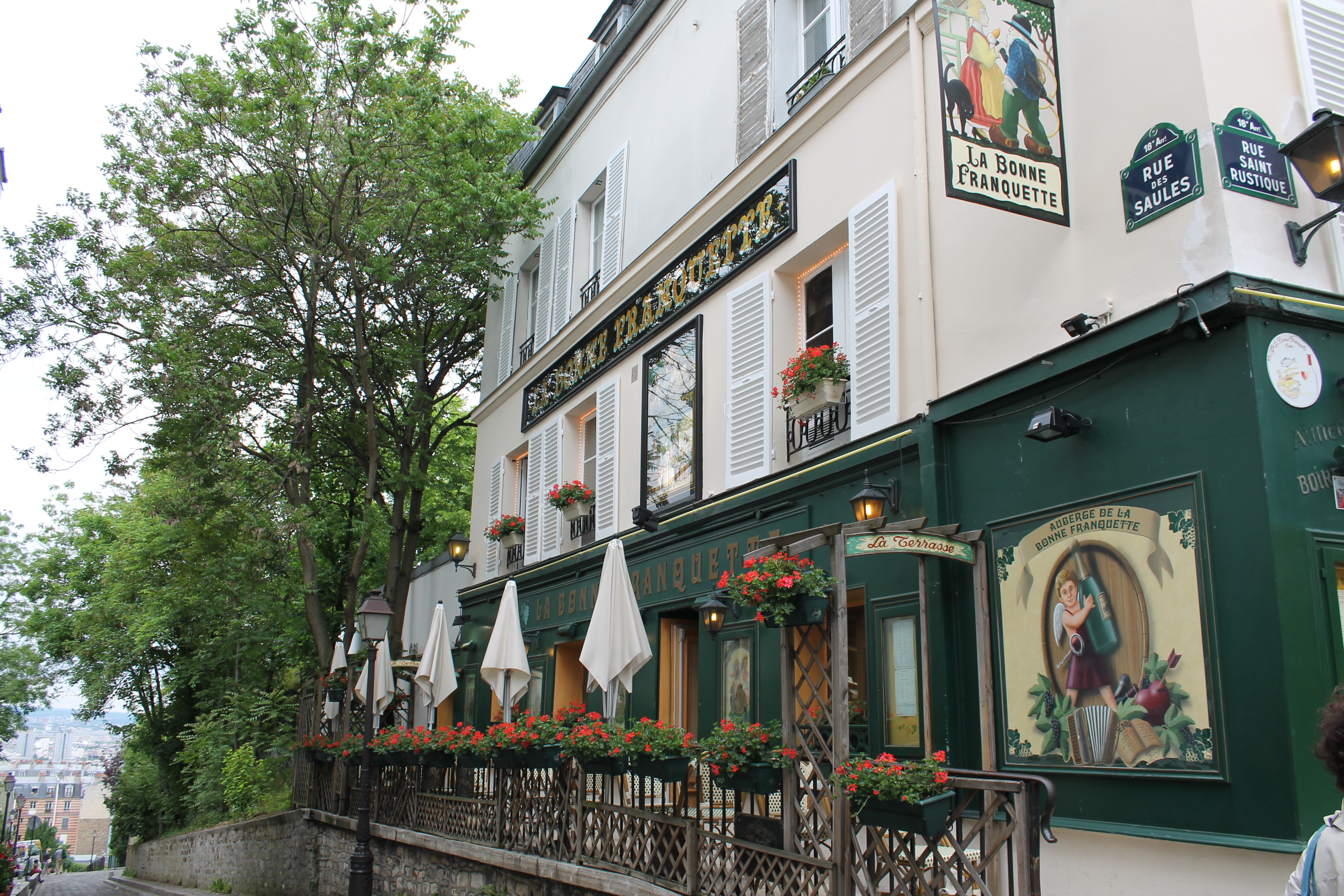 From there, we walked around the corner with our bags and followed the crowds, since not one sign pointed us to la gare (the train station). After a few hours on the TGV — super comfy, big cushy seats — we made it to Paris for an afternoon and evening in Montmartre. Longest taxi ride ever in near grid-locked traffic from Gare de Lyon, but still only 24 euros so didn’t break the bank. We’ve learned not to attempt the Metro with multiple bags, especially if there will be a connection, which there would have been. If you’ve never used the Paris Metro, be forewarned that many steps are involved, some go down just to go right back up FOR NO APPARENT REASON except to bedevil those dragging around bags on wheels. Not to mention the random confusing forks in the road. Someone should create a map of the underground tunnels leading to the various stations. But since I’m not aware of one, take a TAXI!!!!!