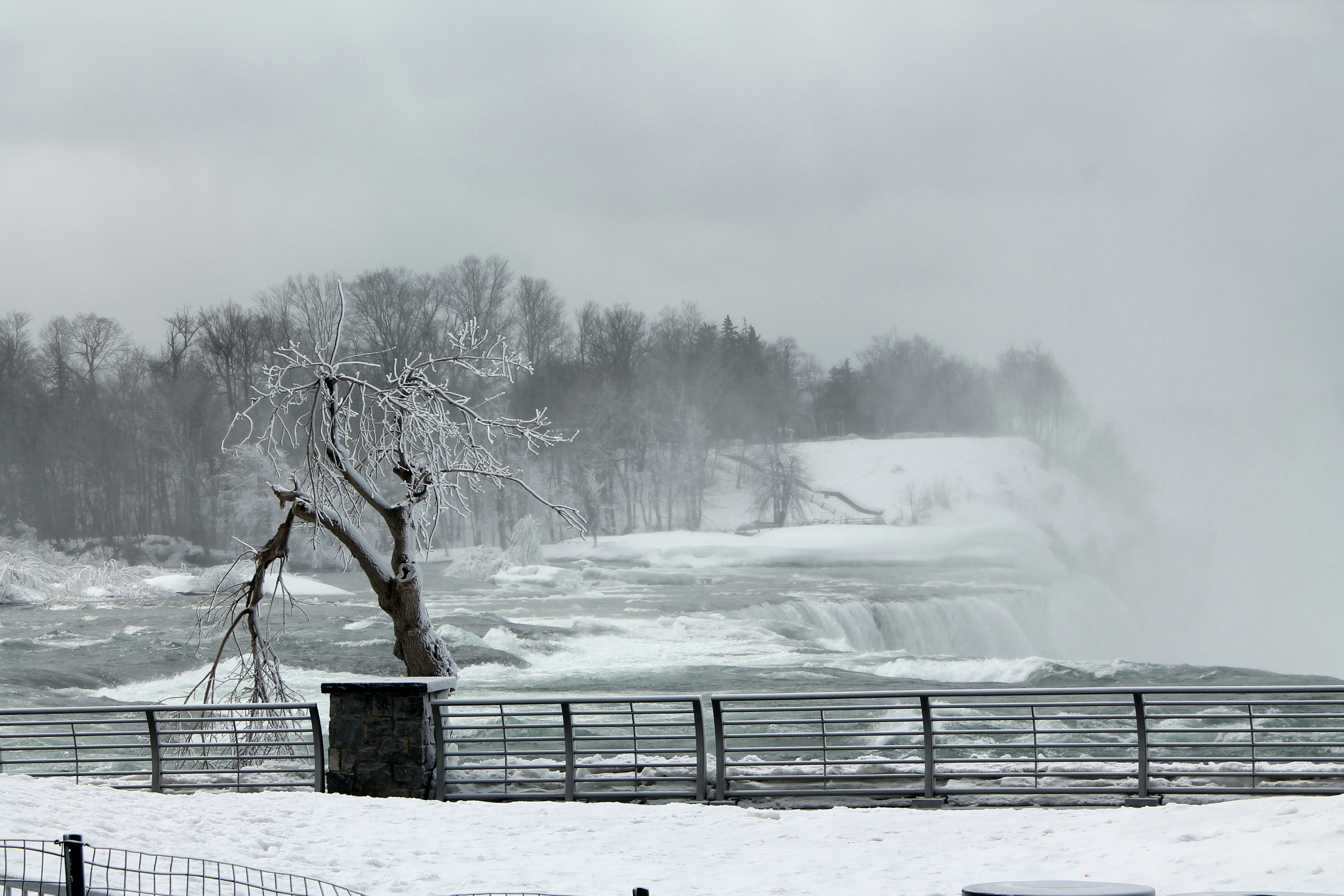 I know it looks like I published these in black and white for artistic effect, but these are regular color photos. This is how cheery and sunny it actually was. Brrrr. The mist flying up instantly turned to ice crystals which pelted us in the face. We lasted about 45 seconds.