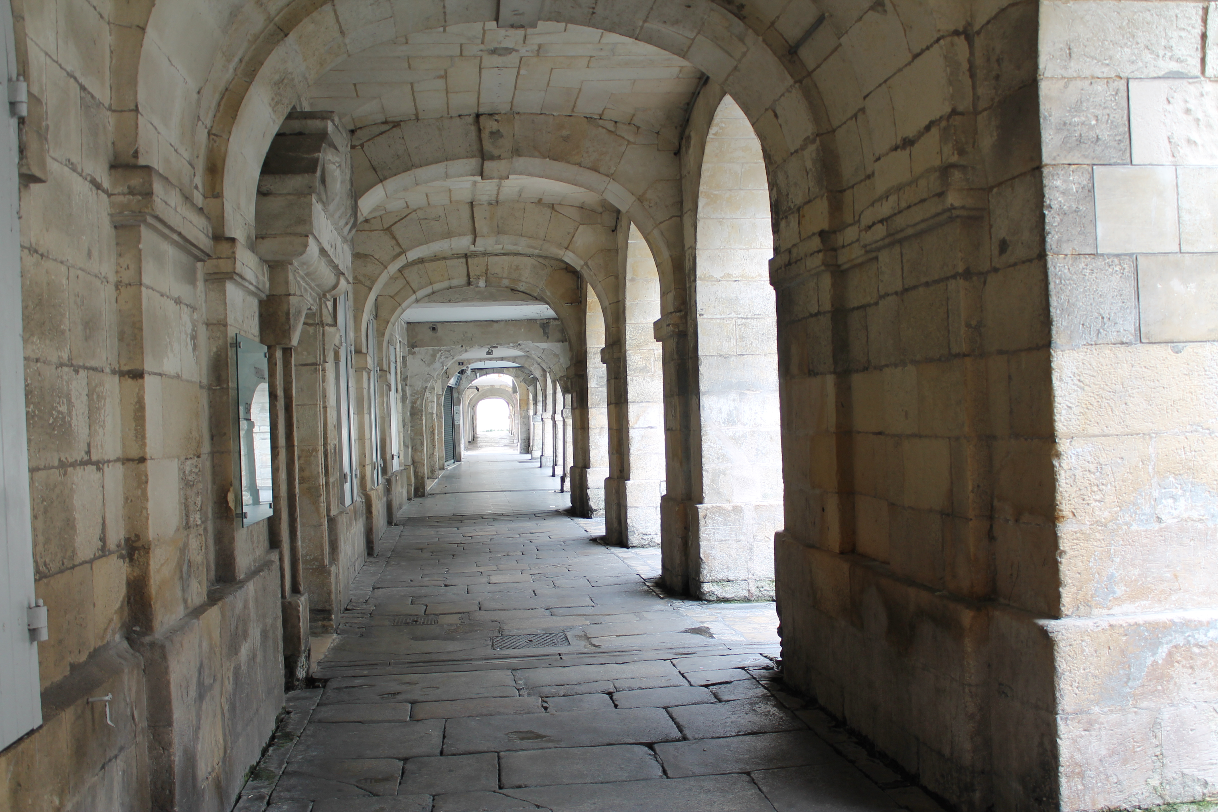 One of the great things about La Rochelle is that there are loads of sidewalks that are covered with beautiful stonework arcades (pronounce ar-cahd, even when plural). This one happens to be empty of people because all the shops are closed on Sundays.