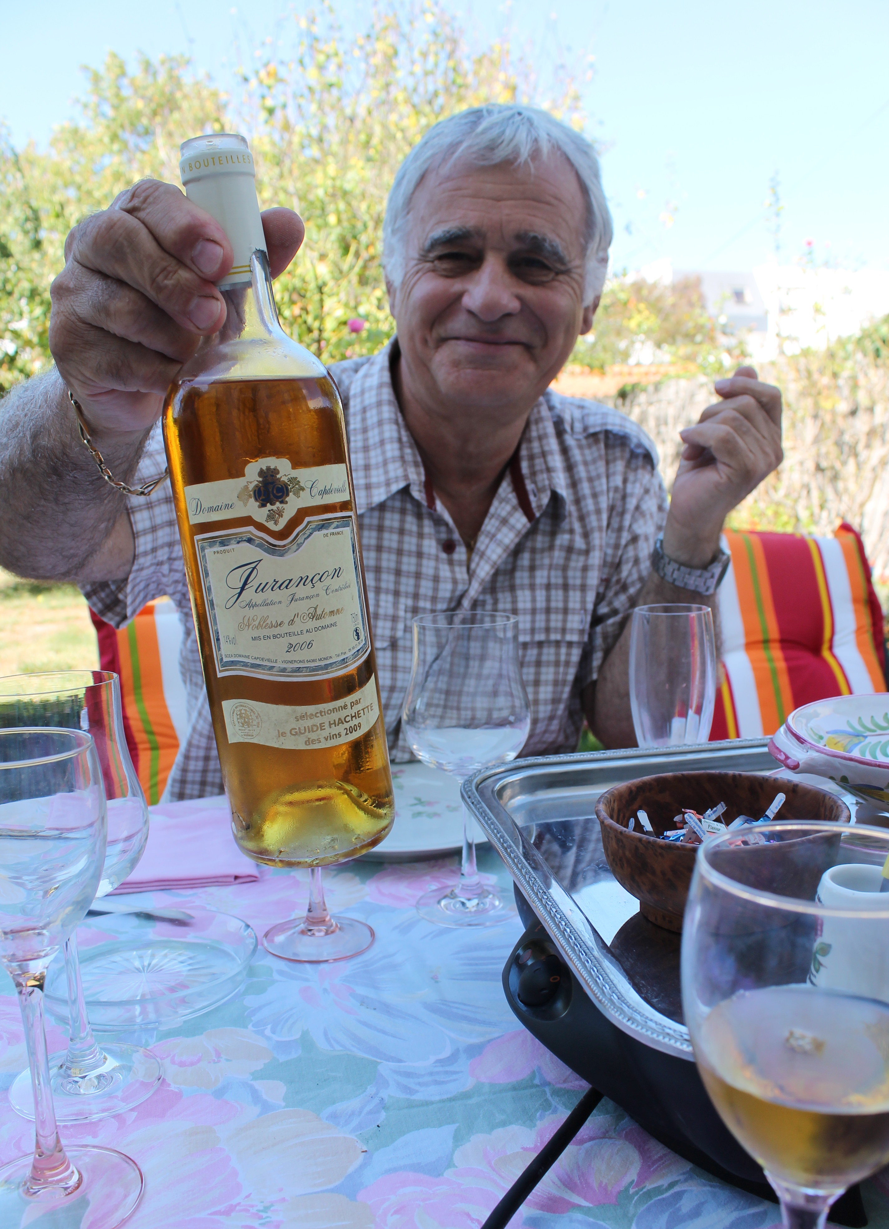 When Brittany visited, instead of meeting Pascale and Jacky at a restaurant, they invited us chez eux (to their house) for another of the fun table BBQ’s we had enjoyed so much a few months ago. Here’s Jacky with the amazing wine we had after les apéritif, to accompany the foie gras du Périgord: