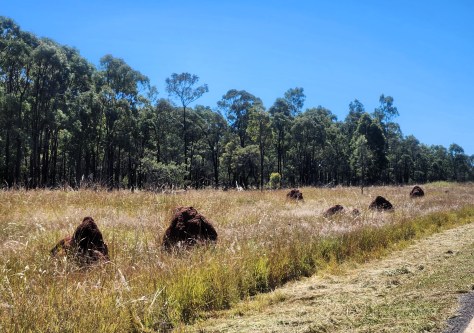 Andy is always on high alert at dawn and dusk, since that’s when the roos are likely to be on the road. I was just enjoying the glorious morning light until it was bright enough for me to get a decent photo of termite mounds. These in the distance were seen while speeding along the day before …